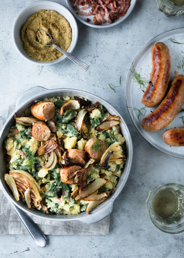 Giet de aardappels af, schep de mosterd, melk en uitgebakken spekreepjes erdoor en stamp tot een grove stamppot. Haal de venkel en ui uit de oven en schep ze door de snijbonen stamppot. Breng eventueel verder op smaak met zout en peper. Serveer met de goudbruine saucijsjes.