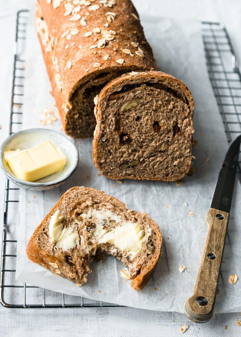 Wij zijn dol op rozijnenbrood! Alleen de meeste versies in de supermarkt bevatten heel veel suiker. Terwijl dit helemaal niet nodig is, want de rozijnen maken het al lekker zoet van zichzelf. We maken dit rozijnen notenbrood met speltbloem en speltmeel. Het is dus voor de helft volkoren. Je kan het ook gewoon van tarwe maken. Wij bakken dit broodrecept in een cakeblik in de oven, maar het kan ook in de broodbakmachine. Lekker met een lik roomboter en een plak kaas.