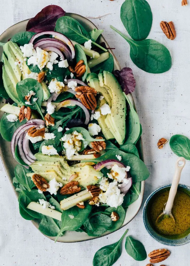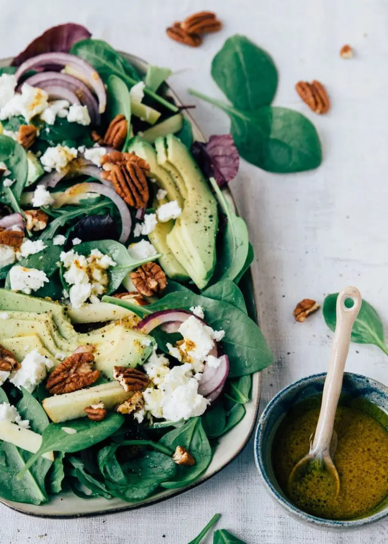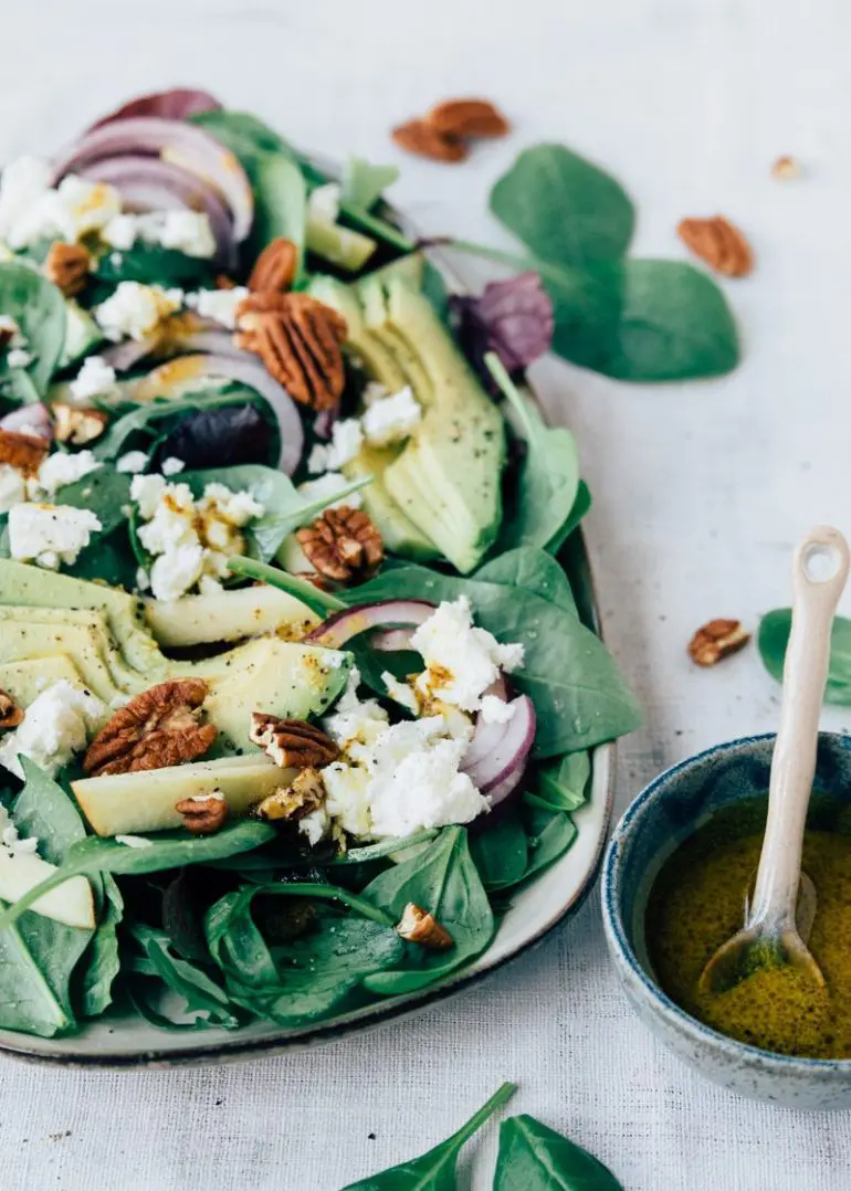 Bij het maken van een salade denk je al snel aan sla als basis. Maar je kunt ook heel goed spinazie gebruiken. Zo hebben wij een heerlijke spinaziesalade gemaakt met feta. Spinazie leent zich supergoed als basis voor een lekkere salade. Het heeft net wat meer smaak. Aan deze spinaziesalade voegen we avocado, feta en rode ui toe. Voor een extra bite gebruiken we pecannoten. Altijd lekker om iets knapperigs toe te voegen aan een salade. We maken een dressing van mosterd, azijn en honing. En zo zet je in nog geen 10 minuten een heerlijke en simpele spinaziesalade op tafel. Een kind kan de was doen!