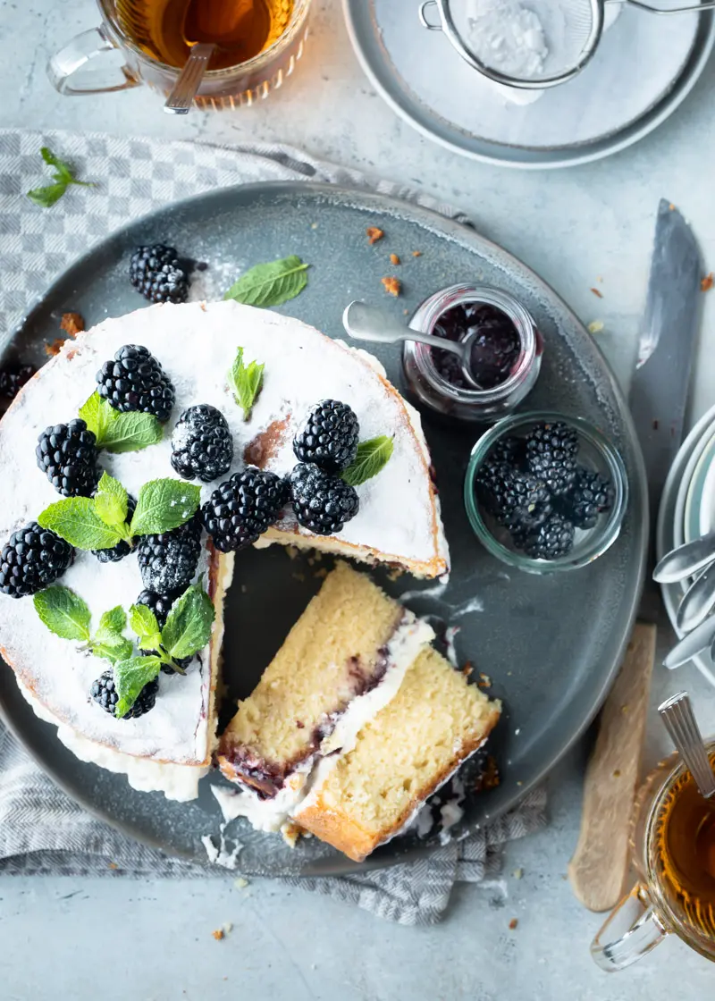 Meng kaneelpoeder door de bramenjam. Klop met een mixer de slagroom en suiker stijf. Bestrijk 1 van de cakes met de bramenjam, verdeel de slagroom er over en druk de tweede cake er voorzichtig op. Bestrooi de bovenkant van de tweede cake volledig met poedersuiker, versier met verse bramen en wat takjes verse munt.
