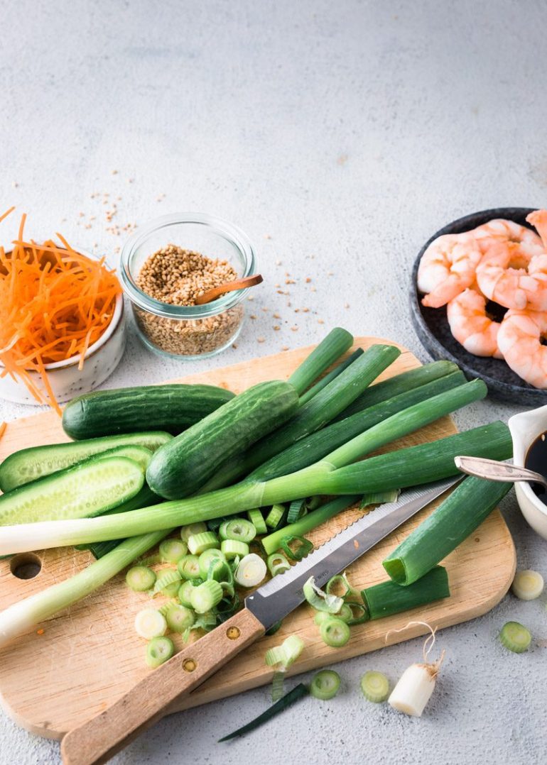 Was de komkommer en snijd in dunne plakjes. Hak de bosuien in ringetjes. Was de appel, halveer hem en snijd het klokhuis er uit. Snijd daarna in dunne plakjes.