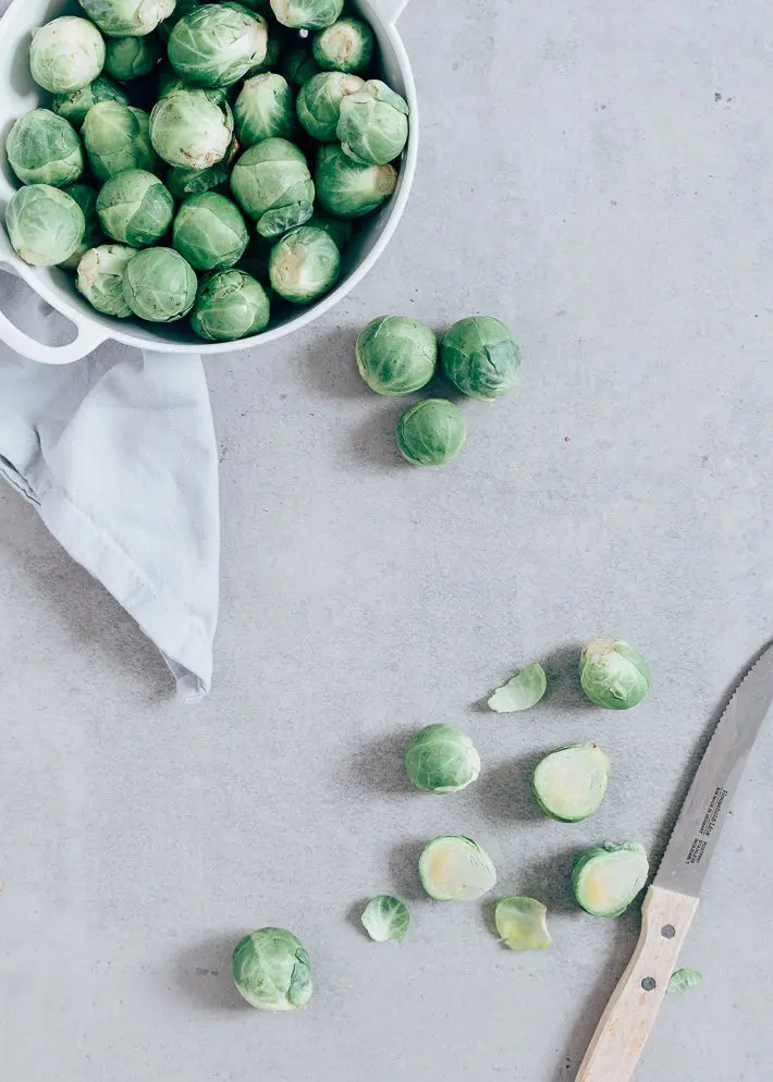 2. Verwijder het kontje van de spruitjes, verwijder het buitenste blad en snijd ze door de helft. Kook ze in ongeveer 5 minuten gaar in water met zout (je kan ze ook bij de aardappelen indoen). Giet ze vervolgens af.