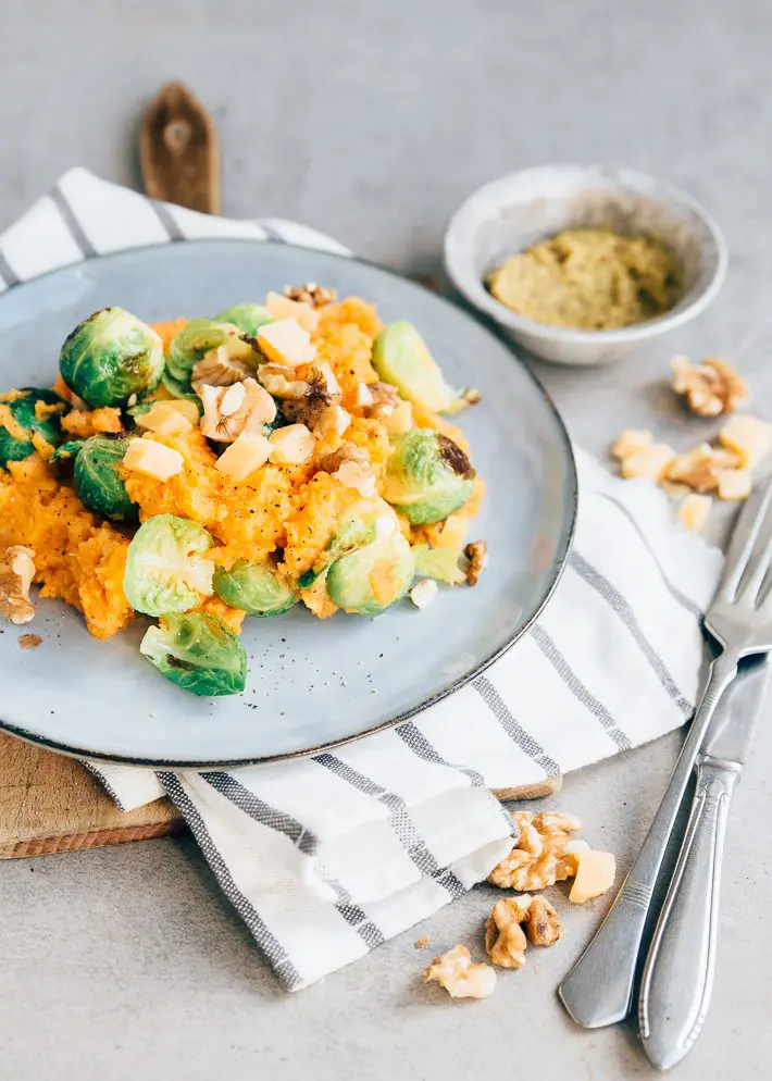 Deze spruitjes stamppot is zo gemaakt en comfort food voor tijdens gure dagen. Zodra het buiten namelijk wat kouder wordt, krijgen wij weer trek in stevige maaltijden. Spruitjes stamppot met spek, lekker Hollands, is hier een goed voorbeeld van. Het past precies bij deze tijd van het jaar. Wij zijn dan ook dol op spruiten, maar ook als je niet zo van spruitjes houdt, vind je deze spruiten stamppot vast een heerlijke maaltijd. Dit stamppot recept kan je zowel met gewone aardappelen als met zoete aardappelen maken. Net wat je lekkerder vindt! Op zoek naar nog een lekker spruitjes recept? Probeer dan ook eens deze gewokte spruitjes met parelcouscous.