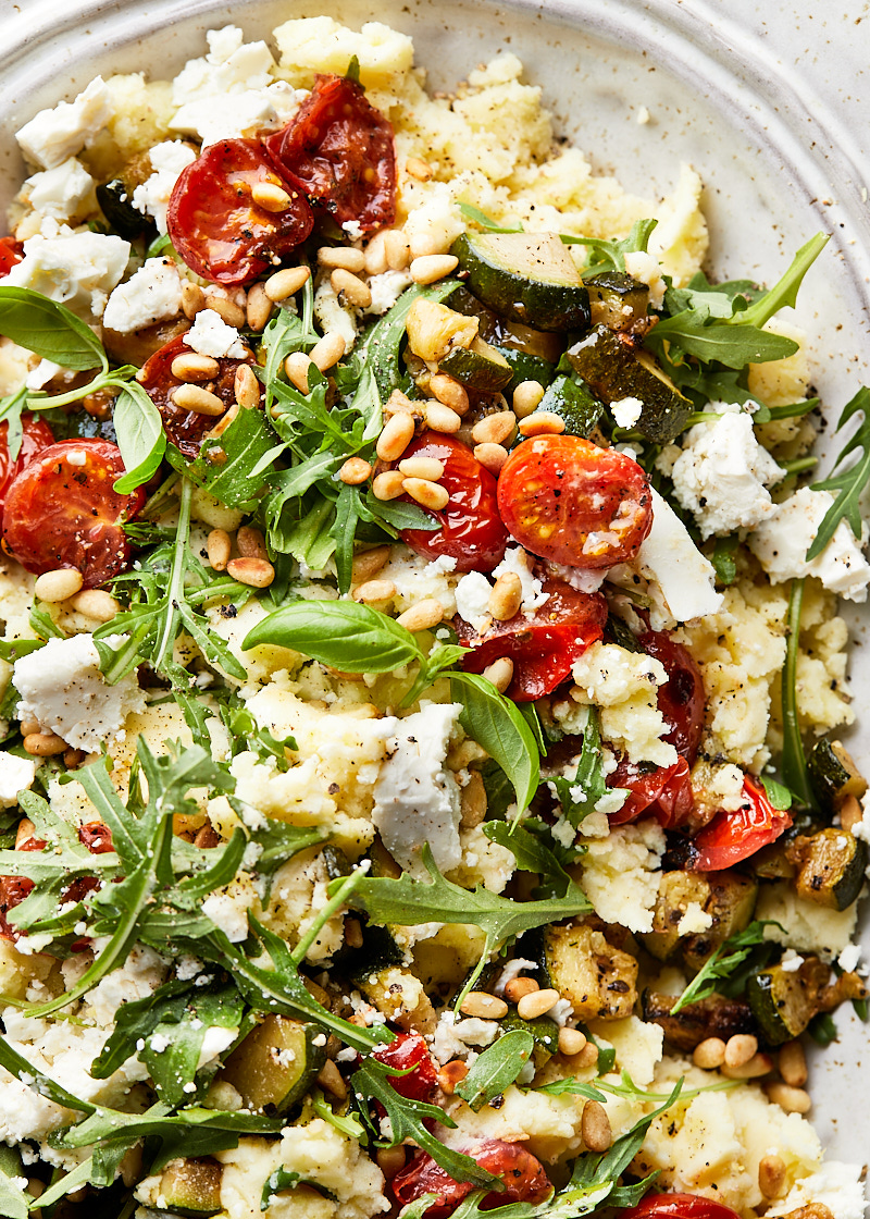 Serveer de rucola stamppot met de pijnboompitten en hele blaadjes basilicum.