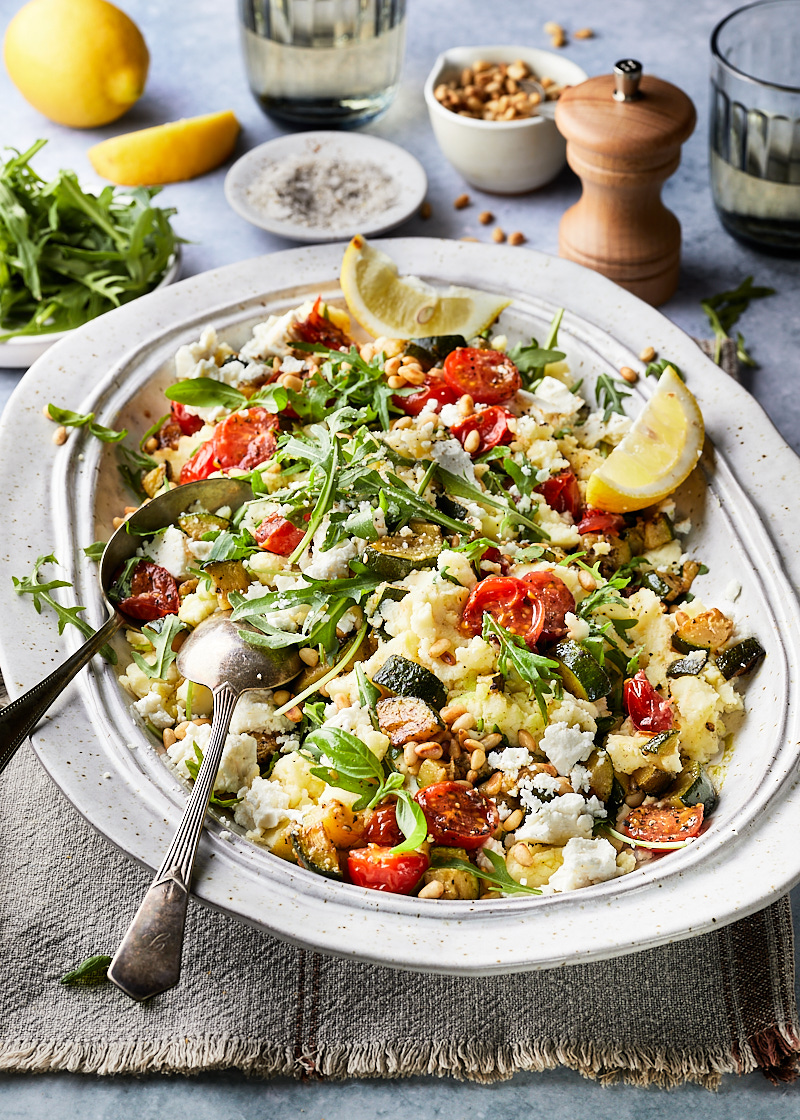 Stamp de gekookte aardappelen met een pureestamper tot een smeuïge puree met de roomkaas, citroenrasp en -sap. Breng verder op smaak met peper en zout. Meng de rucola, courgette, tomaatjes en verkruimelde feta voorzichtig door de puree.