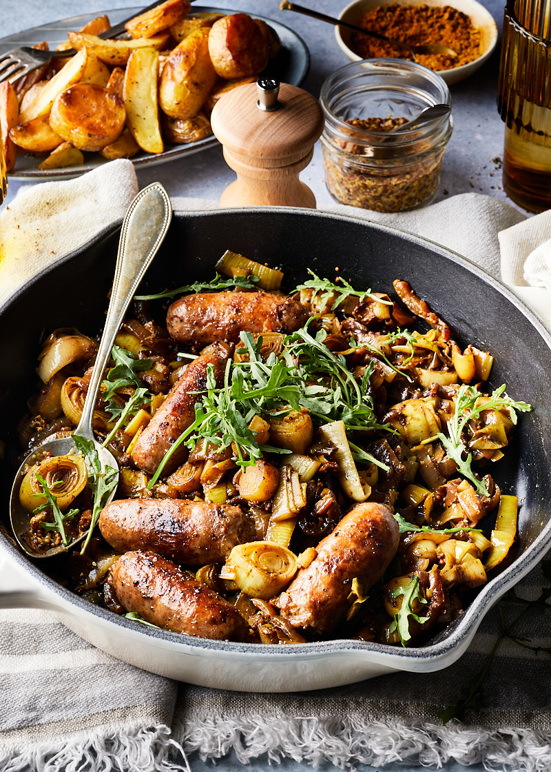 Snijd de uien in halve ringen en de knoflook fijn. Fruit de ui en de knoflook aan in het braadvocht, voeg eventueel nog wat extra boter of olijfolie toe.