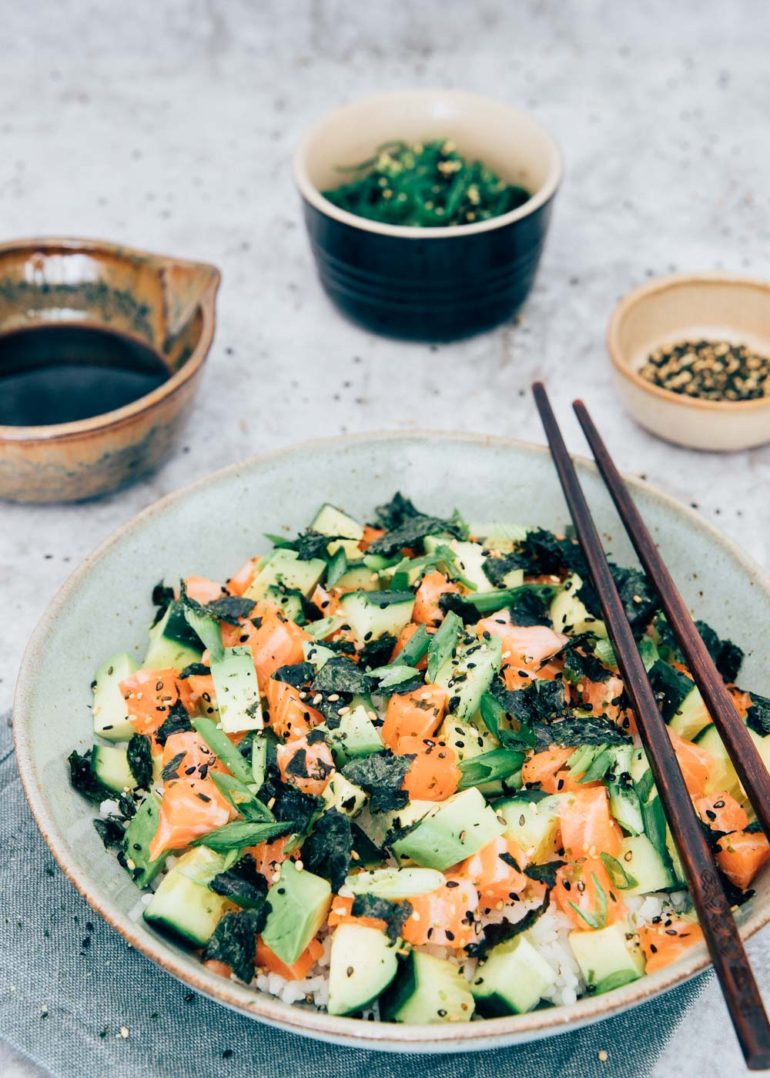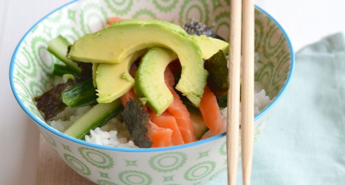 Hou je ook zo van sushi? Dan is deze sushi bowl met zalm een aanrader! Een kom vol met alles wat in je favoriete sushirol zit. Aan dit sushi bowl recept hebben we zalm toegevoegd, maar met verse tonijn is het ook smullen. Ideaal als je weinig tijd hebt of wanneer je niet alweer die sushitent om de hoek wilt bellen.