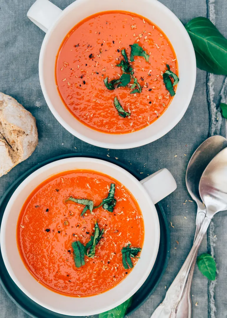 Pureer de tomatensoep glad met een staafmixer. Breng de tomatensoep op smaak met wat peper, zout, de oregano en de verse basilicum. Serveer met brood.