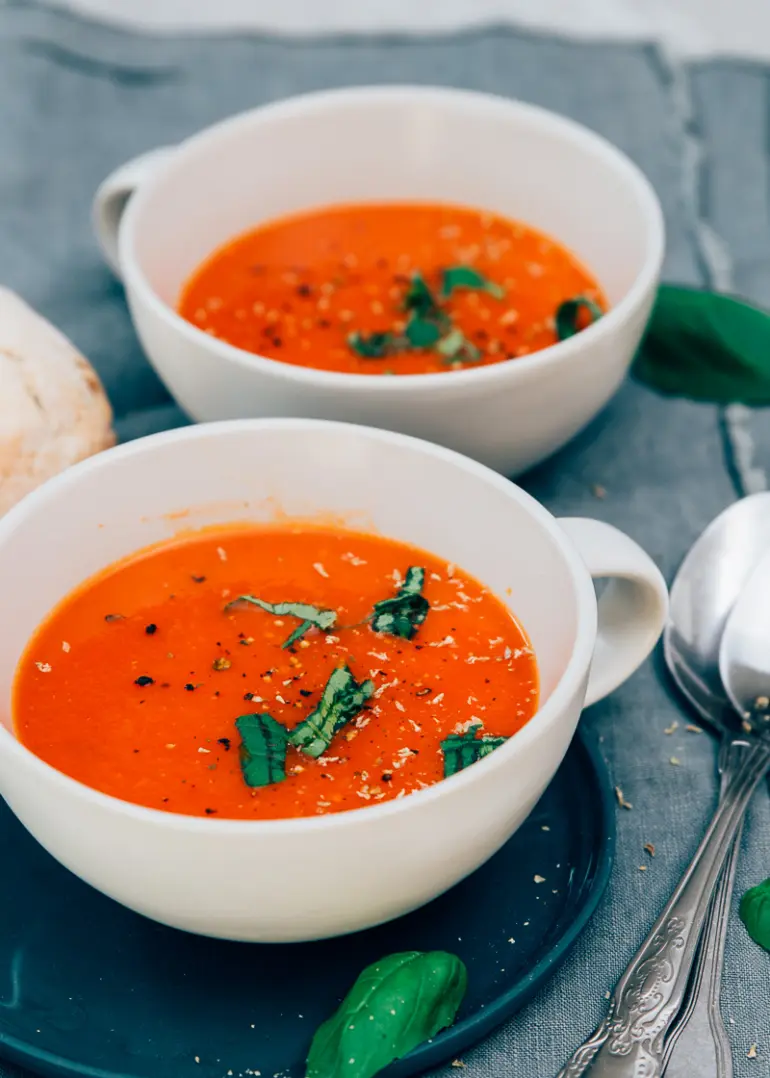 Pel en snipper de uien en hak de rode peper (excl. zaadlijsten) in stukjes, fruit dit aan in een pan met wat olijfolie. Voeg de geroosterde tomaten, de knoflook en een liter bouillon toe. Laat de soep ongeveer 15 minuten koken op een zacht vuur.