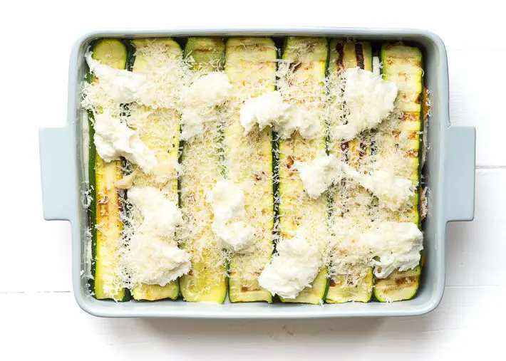 Leg hierop de laatste drie lasagnebladen. Verdeel de courgette over de lasagne. Scheur de mozzarella in stukken en leg deze op de courgette.