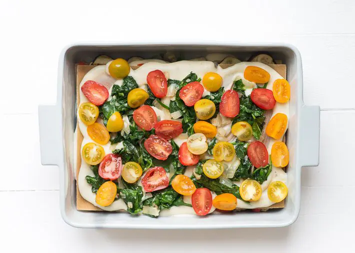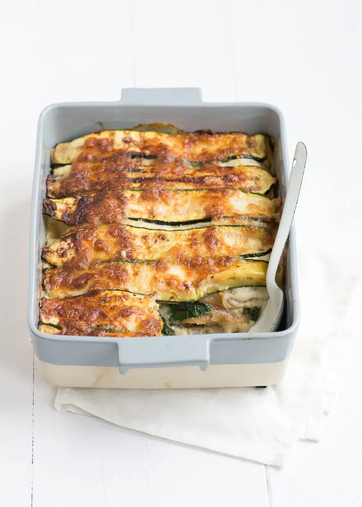 Deze vegetarische lasagne is voor iedereen die dol is op lasagne, maar geen vlees eet. Een lasagne zonder vlees dus, maar een bomvolle groentelasagne met spinazie, paprika, cherrytomaatjes courgette en aubergine. De aubergine, courgette en paprika hebben we eerst gegrild. Hierdoor krijgen de groenten een lekkere smaak en zijn ze ook meteen wat zachter. Daarnaast voorkom je op deze manier dat de lasagne te waterig wordt. Het is even een klusje om deze vega lasagne te maken, maar moeilijk is het niet. Het fijne is dat hij de volgende dag nog lekkerder is. Dus maak hem gerust ’s avonds op je dooie gemak klaar. Dan hoef je de vegetarische lasagne de volgende dag enkel nog even op te warmen. Soms moet je het jezelf makkelijker maken. Maak er een lekkere salade bij en je hebt een heerlijk avondje dolce vita.