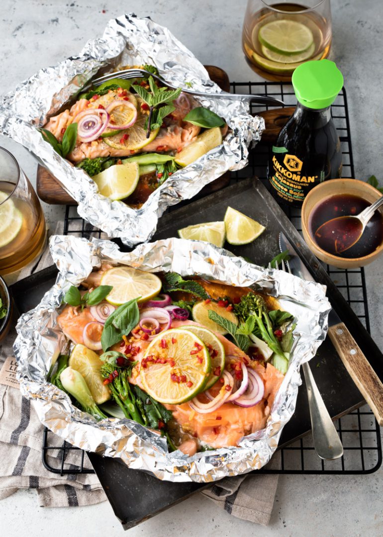 Zin in vis op de bbq maar lijkt je dit veel gedoe? Maak dan eens deze vispakketjes van de BBQ met zalm. Het is heel simpel, kost je weinig tijd, je kan het gemakkelijk voorbereiden en het is vooral heel lekker. We maken deze vispakketjes in Aziatische stijl. We marineren de zalm in KIKKOMAN sojasaus, met wat rode peper, honing en mirin. Een echte smaakbom en veel meer heb je dan ook niet nodig. We voegen nog wat paksoi en bimi toe (best wel gezond dus). Garneer de zalm met extra limoentjes en wat verse kruiden en klaar ben je. Steek de barbecue vast maar aan!