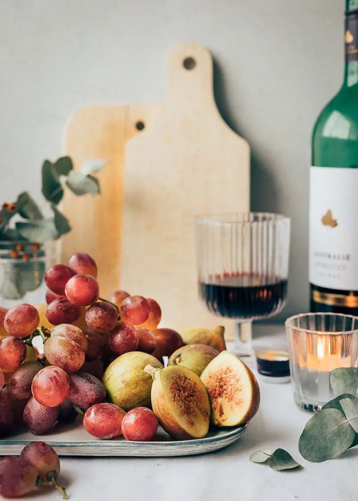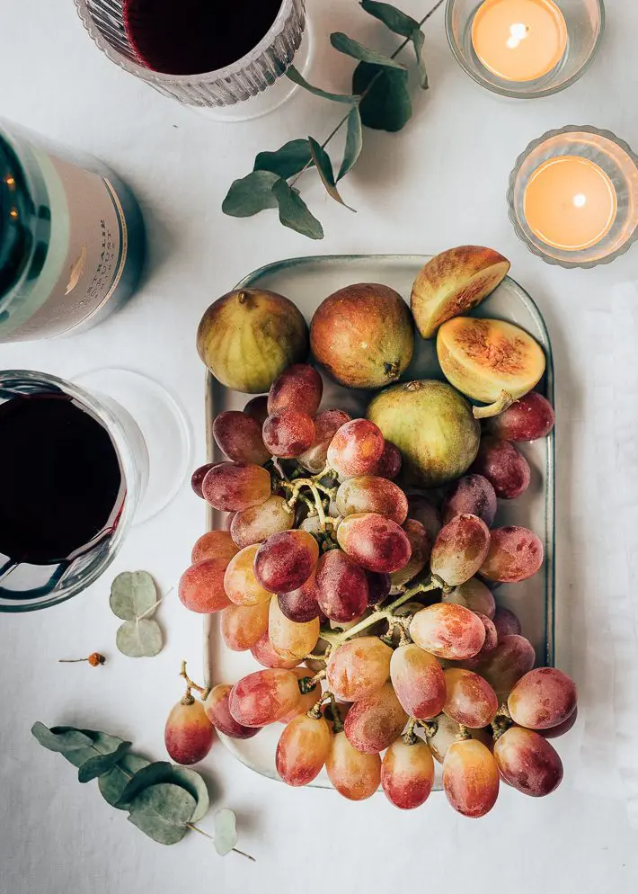 Halveer de vijgen en knip de druiven in trosjes. Leg ze op een bakplaat. Bestrijk het fruit met wat honing. Besprenkel met 1 eetlepel olijfolie en wat zout en zet 15 minuten in de oven.