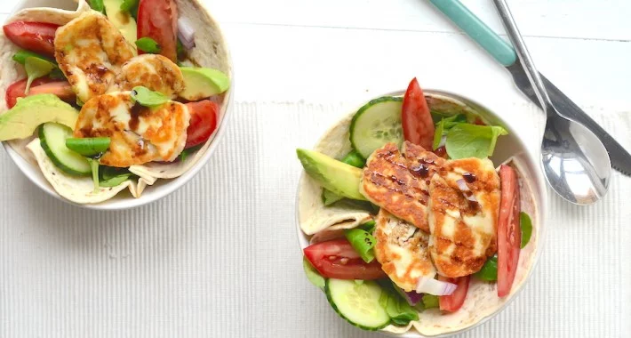 Het is weer woensdag dus ik heb weer een Fast & Freshje voor jullie. Dit receptje voor Griekse wrap bowl is een fluitje van een cent. Als je wilt staat het binnen 10 minuten op tafel. Ik heb mijn ó zo geliefde Halloumi kaasje weer eens uit de koelkast getrokken. Voor wie Halloumi niet kent, het is een Grieks danwel Turks kaasje dat zich perfect laat grillen. De structuur is vrij stevig en de smaak is iets zoutigs. Super lekker vind ik het. Je kunt het bij de Turk halen, maar de Ap heeft het tegenwoordig ook.