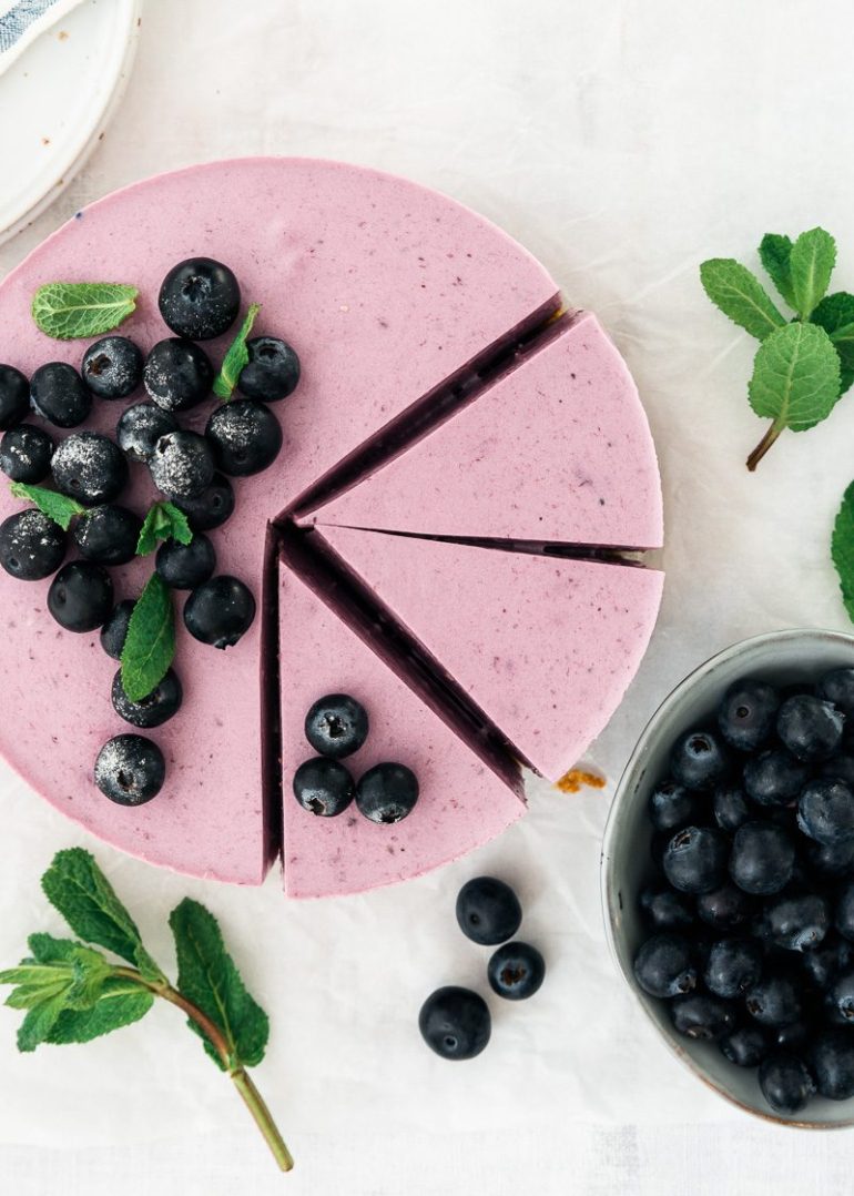 Garneer de yoghurttaart eventueel met blauwe bessen, blaadjes verse munt en poedersuiker.