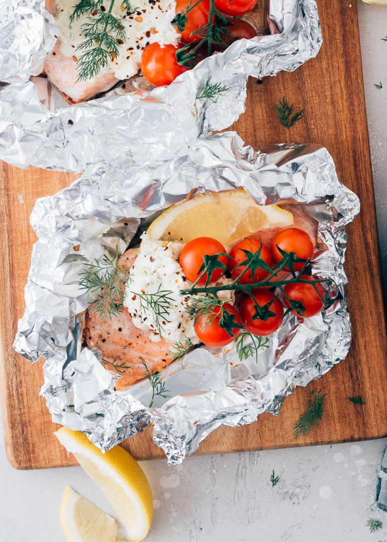 Pak een stuk aluminiumfolie (of bakpapier) en leg de vis hierop. Leg de zalm in het midden. Leg er een lepel kruidenkaas bovenop. Leg de cherrytomaten en een partje citroen ernaast. Maak het af met een takje dille.