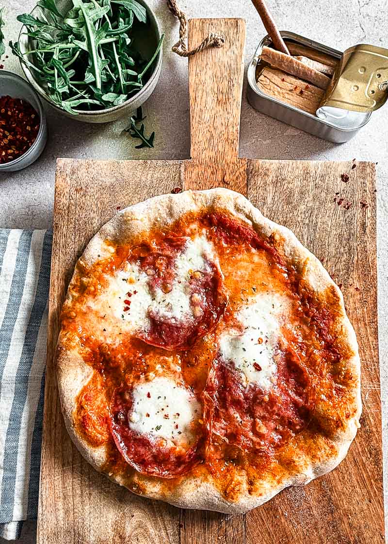 Bak de zuurdesem pizza’s in ongeveer 5 tot 7 minuten af in de voorverwarmde oven op 250 graden.